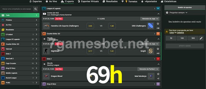O 69h oferece uma grande seleção de opções de apostas em e-sports com probabilidades competitivas